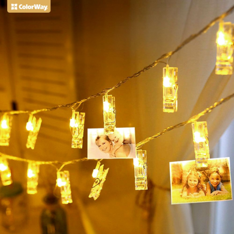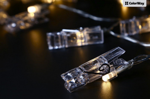 Світлодіодна гірлянда СolorWay з прищіпками для фото 40 LED/4.2M - Джерело живлення: 3 х АА батарейки (Не входять до комплекту); Напруги: 4.5В; Матеріал: пластик; Довжина: 4.2 м; Розмір прищіпки: 5.5 х 1.2 см; Колір: прозорий; Термін служби світлодіодів: 10 000 годин; Світло: тепле біле