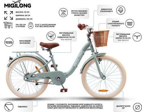 Miqilong LS 20 - це втілення сучасного уявлення про ретро дизайн. Використання фарбування у стилі 50-х років XX століття та кошика ручної роботи з натурального ротанга роблять дизайн велосипеда вишуканим та елегантним.