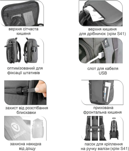 Рюкзак Vanguard VEO Adaptor S41 продуманий до дрібниць, що робить його мультифункціональним, та піднімає комфорт використання на новий рівень. Два великі бічні входи в основне відділення роблять доступ до камери зручним, з якого плеча Ви б не зняли рюкзак. Рюкзак має нагрудний та поясний ремені, що дозволяють розвантажити плечі, якщо рюкзак важкий, та активно пересуватись. Коли в ременях немає необхідності - вони можуть бути зняті, чи складені в спеціальні приховані кишеньки. Прихована текстильна п'ята, знімний ремінець на фастексі, бічні кишені та система петель дозволяють зафіксувати повнорозмірний штатив в трьох різних положеннях зовні рюкзака. М'яка внутрішня кишеня вміщає планшет з діагоналлю до 11".