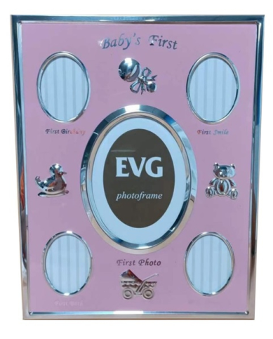 Рамка на 5 фото. Матеріал – метал. Колір: рожевий. Загальний розмір: 18.5*23.5*1.4см