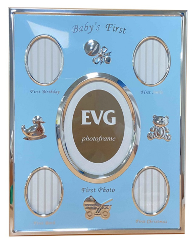 Рамка на 5 фото. Матеріал – метал. Колір: голубий. Загальний розмір: 18.5*23.5*1.4см