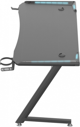 Класична прямокутна форма стільниці забезпечує достатній простір для розміщення всіх необхідних ігрових пристроїв та аксесуарів. Велика площа стільниці – 120 см завдовжки та 60 см завширшки, дозволяє розмістити комп'ютер, монітор, різні пристрої та залишає достатньо вільного місця. Висота 73 см оптимальна для більшості користувачів, забезпечуючи комфортне положення тіла та мінімізуючи навантаження на спину та шию. На столі передбачені спеціальні тримачі для навушників та підсклянник, що дозволяє завжди мати під рукою необхідні аксесуари та напої, не захаращуючи при цьому робочий простір. Крім того, у стільниці розташовані отвори для шнурів, що допомагає організувати кабелі та уникнути безладу. Особливу увагу варто приділити LED-підсвічуванню, розташованому по краях столу. Вона не тільки додає стильного акценту, а й створює атмосферу, що занурює в ігровий процес.