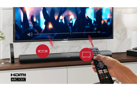 HDMI ARC/CECПід'єднання до телевізора стало простішим: завдяки наявності роз'єму HDMI ARC вам знадобиться лише один кабель для під'єднання саундбара Sharp до телевізора. Якість передавання даних буде надзвичайно стабільною та без перешкод. Технологія HDMI CEC також спрощує роботу з пультом дистанційного керування. Тепер саундбару не потрібні додаткові елементи керування — ви просто керуєте ним за допомогою пульта ДУ телевізора.