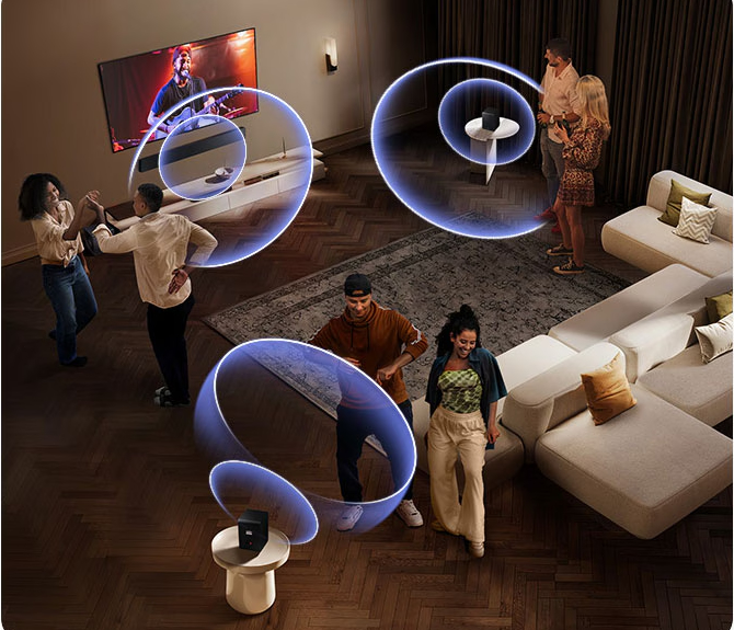 Синхронізуйте тилові динаміки з основним саундбаром, щоб забезпечити гармонійне відтворення одного і того ж звуку. Завдяки захопливій музиці, яка заповнює всю кімнату, ви можете танцювати у запальному ритмі.