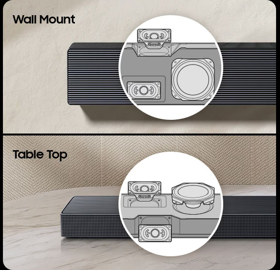 Динаміки розроблені так, щоб працювати як передні, так і направлені вгору динаміки, автоматично змінюючи напрям вихідного звуку залежно від розташування саундбара.