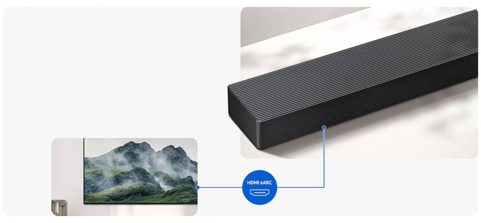 Саундбар оснащений технологією HDMI eARC, яка забезпечує плавну передачу звуку від телевізора та підключених до нього пристроїв. Тепер ви можете насолоджуватися 3D-форматами об'ємного звуку, такими як Dolby Atmos, у найвищій якості.