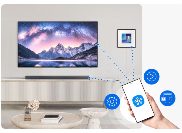 Легко керуйте саундбаром за допомогою застосунку SmartThings. Підключіть саундбар до мобільного пристрою через Wi-Fi, щоб налаштувати параметри звуку, увімкнути групове відтворення або отримати доступ до голосового асистента та функцій потокової передачі музики.