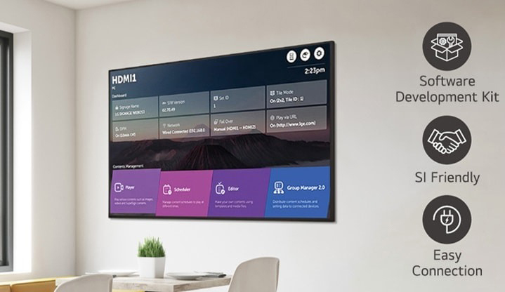 43UH5N-M оснащений високопродуктивною системною, яка дозволяє виконувати безліч завдань без окремого медіаплеєра. Платформа webOS надає інструменти для розробки додатків з інтуїтивно зрозумілим інтерфейсом, що підвищує зручність для користувача, дозволяючи легко підключати зовнішні датчики та партнерські додатки webOS для створення зручного середовища.