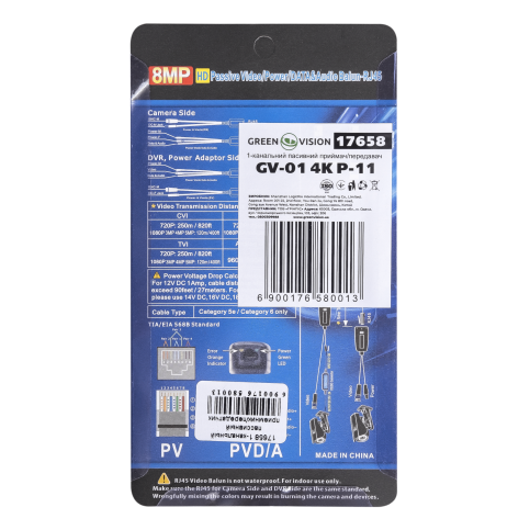 Одноканальный приемник/передатчик видеосигнала по кабелю витая пара GV-01 4K P-06, предназначен для передачи сигнала с видеокамер: