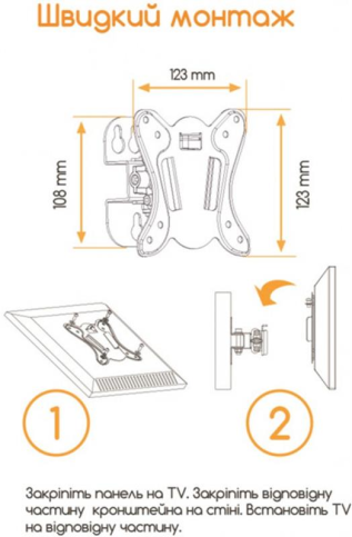 Компактний і сучасний кронштейн, призначений як для телевізорів, так і для моніторів, підтримує VESA. Здатний витримати вагу до 25 кг, підтримує телевізори та монітори з діагоналлю 13-32 дюйми, швидке навішування, легкий у використанні. У комплекті з кронштейном ви знайдете: рівень для рівного встановлення кронштейна, органайзери для кабелів телевізора або монітора, кріплення для монтажу та інструкцію щодо експлуатації продукції.