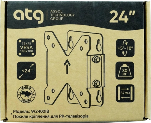 Кронштейн ATG W2400IB Похиле кріплення Діагональ: 24" Навантаження: до 30 кг Кут нахилу: -10°~+5° Відстань від стіни: 37 мм Відповідає стандартам VESA: від 75х75 до 100х100 мм Колір: чорний Усі необхідні для встановлення кріплення в комплекті W2400IB