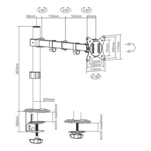 Кріплення дозволяє повертати, висувати, втягувати або нахиляти дисплей, а також повертати монітор з альбомного розташування до портретного. У комплекті є міцний затискач для легкої та надійної фіксації на столі.