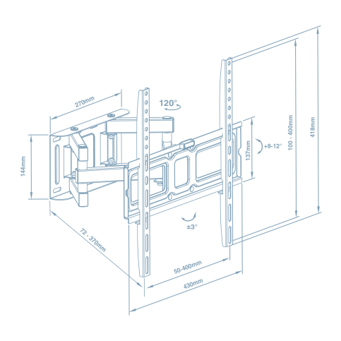 Настінний кронштейн для ТБ Діагональ:: 26"" - 55"", VESA: макс 400х400 мм Навантаження: до 35 кг Нахил: +8 град ~ -12 град Поворот: до 120 град. Обертання: +3град ~ -3град Відступ від стіни: 72-370 мм Колір чорний Рівень точної установки